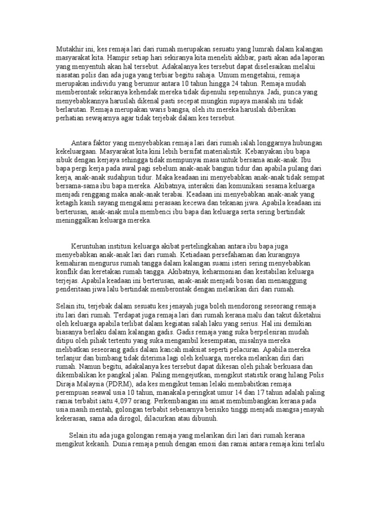 'kasih ibu dibawa ke syurga, kasih ayah tiada pengganti'. Cara cara menangani isu remaja lari dari rumah. Karangan punca remaja lari dari rumah dan cara mengatasi. Remaja yang lari dari rumah biasanya berhadapan dengan masalah sosial seperti ditipu dan diperdagangkan, tiada tempat bergantung, dan tiada masa depan yang baik. Mutakhir ini, kes remaja lari dari rumah merupakan sesuatu yang lumrah dalam kalangan masyarakat kita.