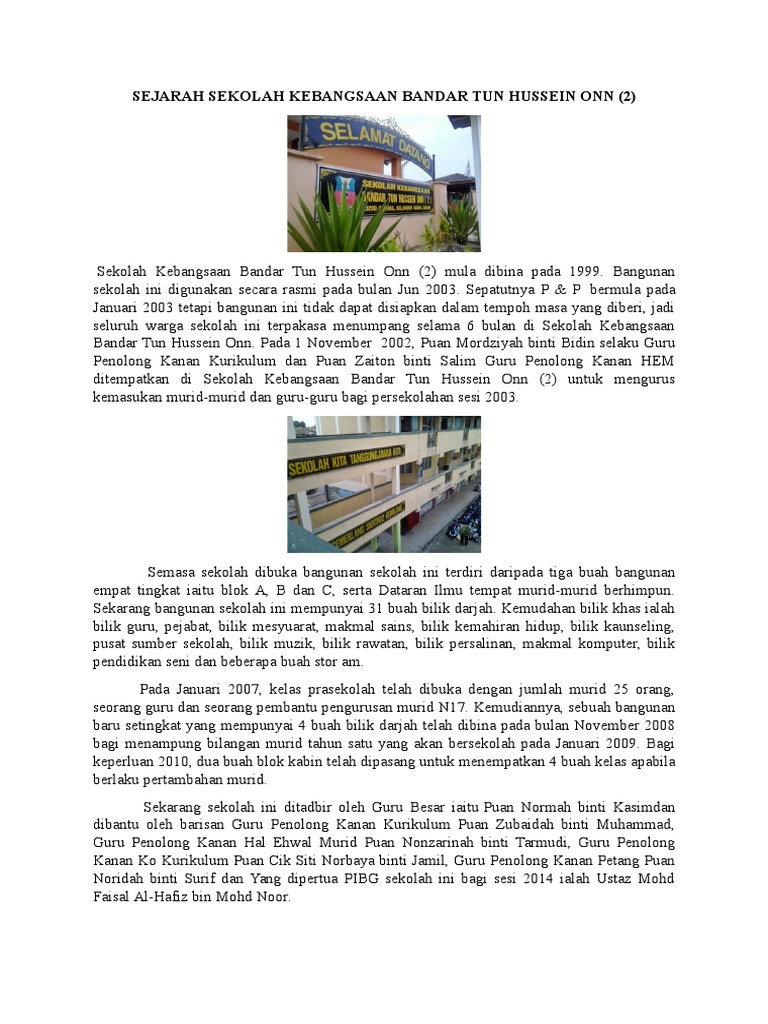 Sk Bandar Tun Hussein Onn 2 - 1 / Pada 2009, sekolah kebangsaan bandar tun hussein onn 2 memiliki 1022 pelajar lelaki dan 958 pelajar perempuan, menjadikan jumlah keseluruhan murid seramai 1980 orang.. Bangunan sekolah ini digunakan secara rasmi pada bulan jun 2003. Majlis bacaan yasin dan ceramah sempena maal hijrah. Sekolah kebangsaan bandar tun hussein onn 2 atau nama ringkasnya sk bandar tun hussein onn 2, merupakan sebuah sekolah kebangsaan yang terletak di jalan suadamai, bandar tun hussein onn. More images for sk bandar tun hussein onn 2 » View larger map or find the direction to sk bandar tun hussein onn 2.