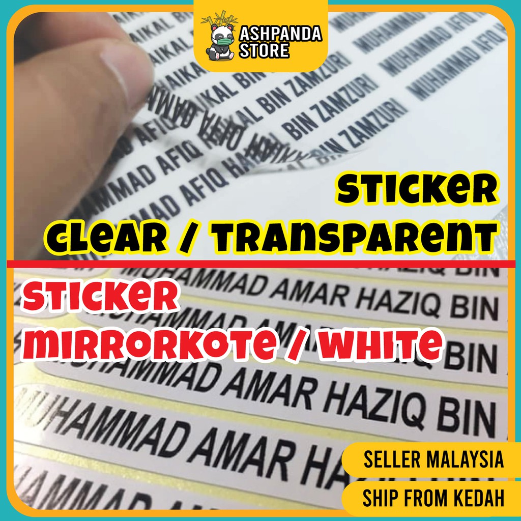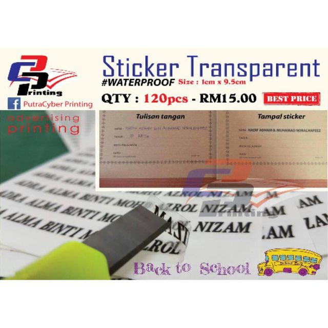 Jom tempah sticker nama buku sekolah dengan sticker cool. Tidak boleh campur nama dalam setiap set. Buku sekolah anak kelihatan kemas jika menggunakan label nama ini. 50pcs =rm10 100pcs= rm18 ***** untuk transparent size: Boleh ditampal pada buku, botol, alat tulis etc.
